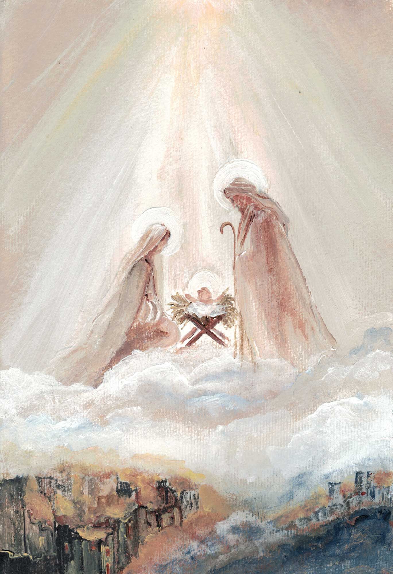 Il dipinto è stato realizzato con amore dall’artista Mara Gavagnin e rappresenta la Natività soprastante la distruzione provocata dalla follia omicida degli uomini.